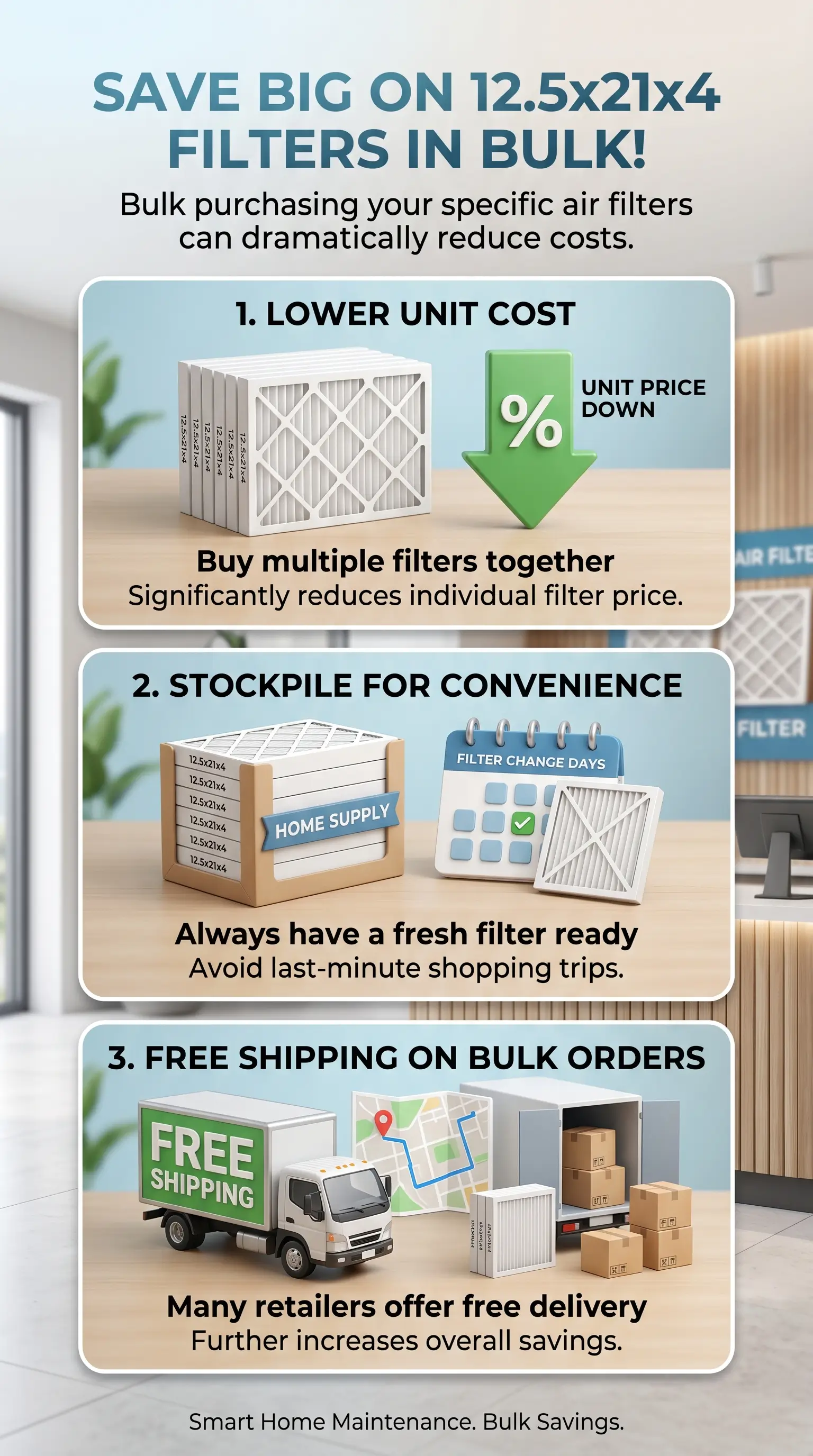 Buying 12.5x21x4 air filters in bulk reliably saves 15% to 40% per filter. This size is a media-cabinet filter, not a big-box staple, which is exactly why bulk buying matters more here than for common 1-inch filters. Most households cycle through four filters per year per system, so a 4-pack hits the sweet spot and a 6-pack covers roughly 18 months. If you're still thinking through how filter choice affects system performance, this air filter guide is worth a read before you commit to a bundle size.
